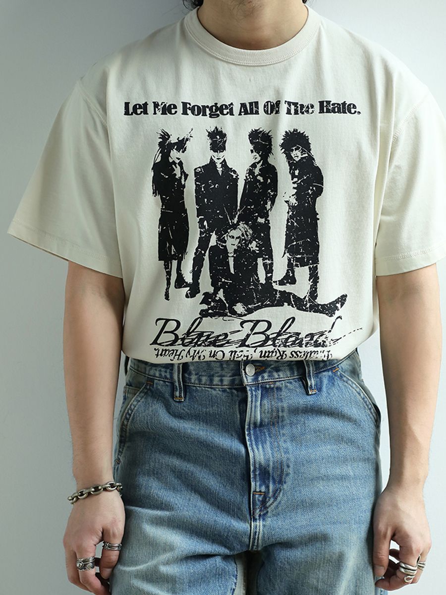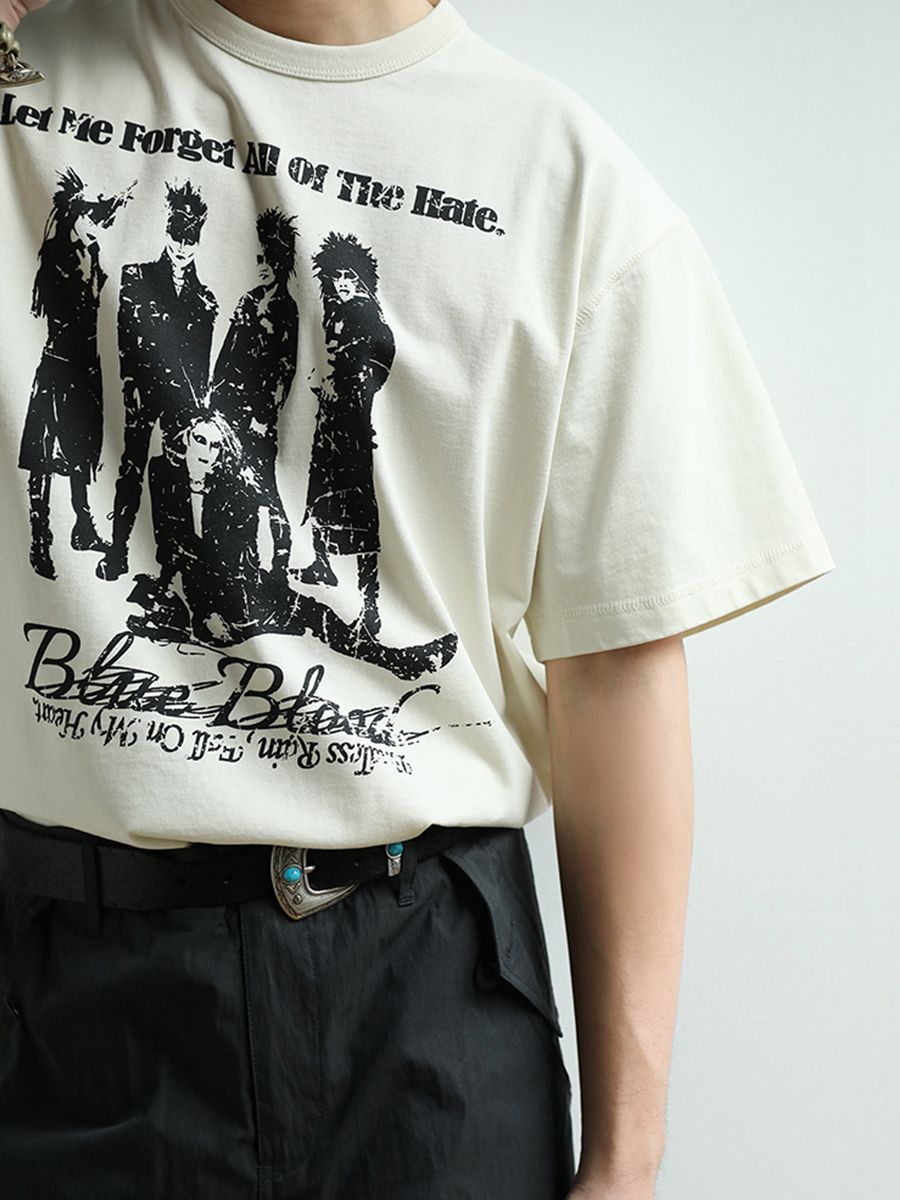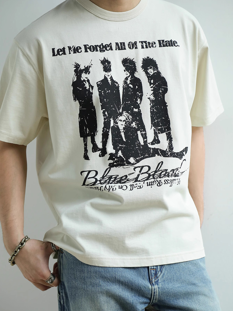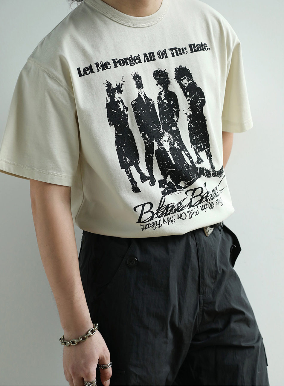 - 아시아 최초로 세계에 진출한 록 밴드 그룹 X JAPAN의 사진이 실크스크린 인쇄된 얼룩덜룩한 질감이 레트로한 클래식한 디자인의 티셔츠입니다.