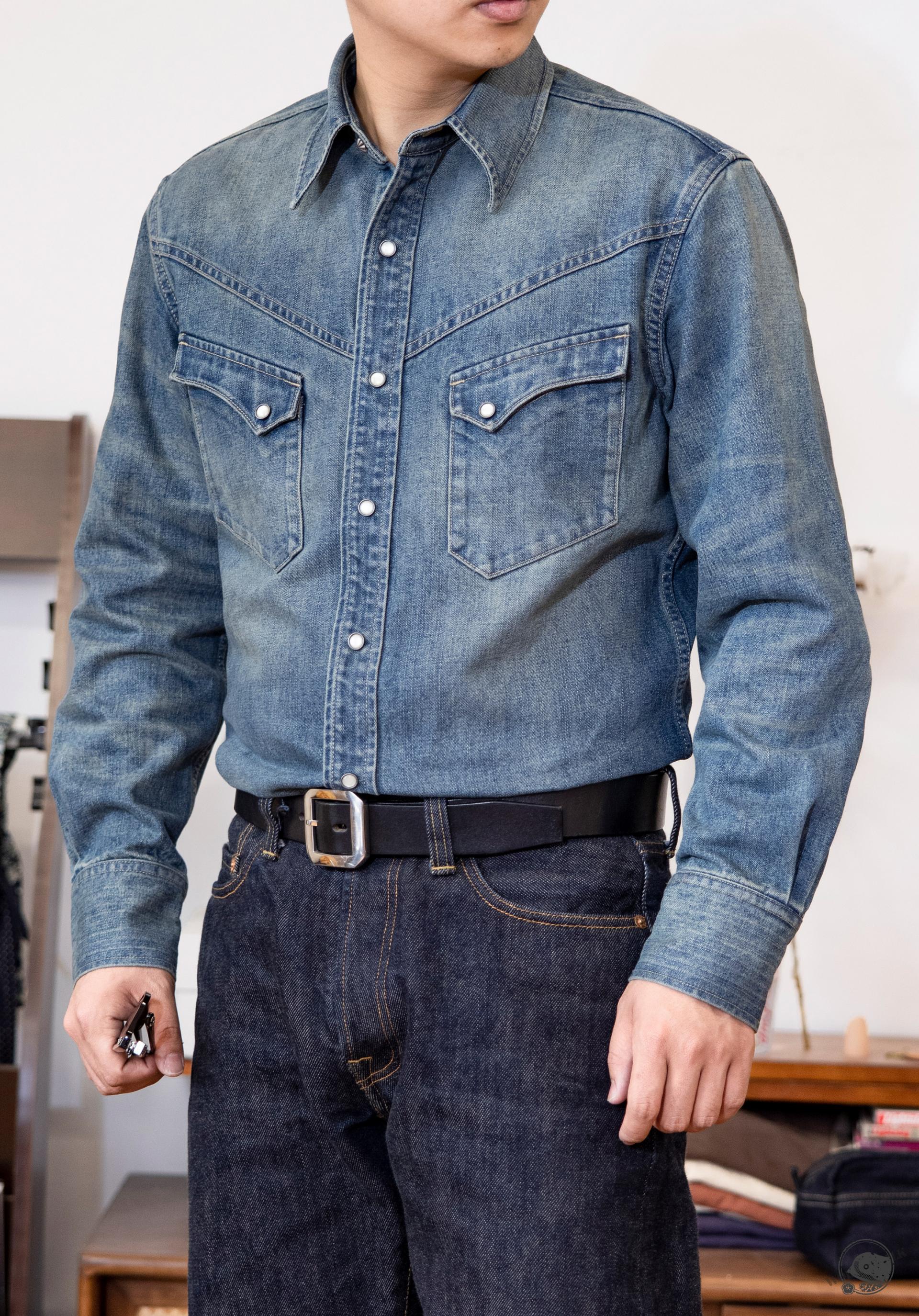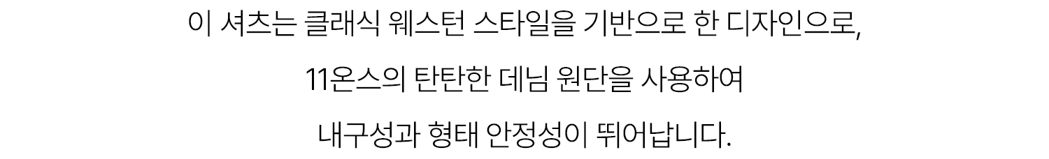• 11온스 중량감 있는 데님 원단에 빈티지한 워싱을 더한 웨스턴 셔츠로 전면의 판쵸 요크 절개와 스냅 버튼 디테일이 클래식 웨스턴 무드를 완성하며 자연스러운 페이딩과 유연한 착용으로 데일리와 라이딩 스타일 모두 소화 가능한 아이템입니다.