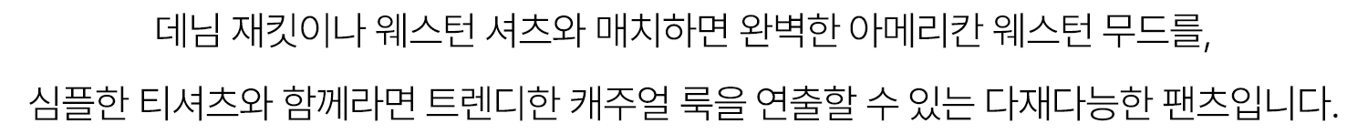 - 다양한 상의와 매치되어 웨스턴 무드부터 캐주얼 스타일까지 연출 가능합니다.