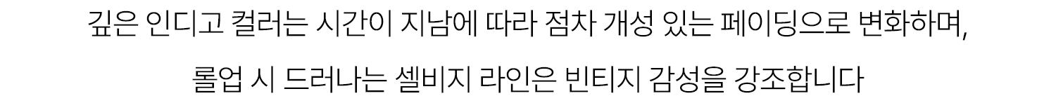 - 롤업 시 드러나는 셀비지 라인으로 빈티지한 무드를 완성합니다.