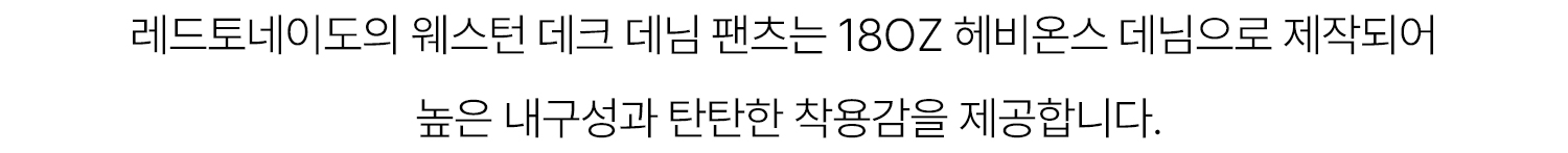 • 18oz 헤비온스 원단으로 제작된 웨스턴 데크 데님 팬츠로 묵직한 중량감과 루즈 스트레이트 실루엣으로 빈티지한 웨스턴 무드를 완성합니다.