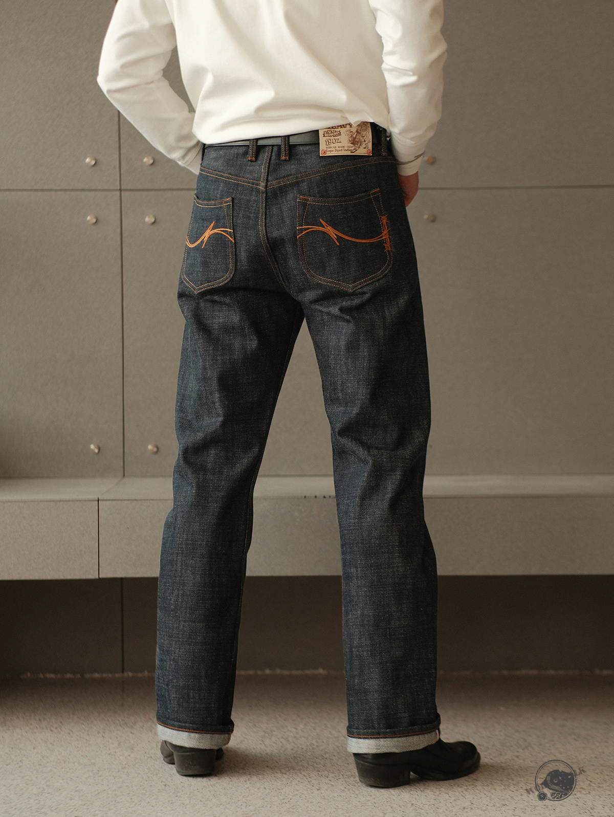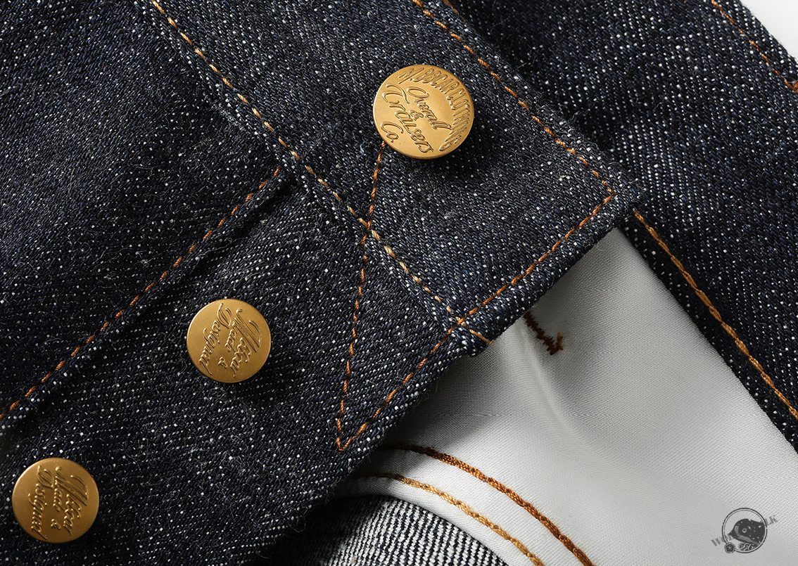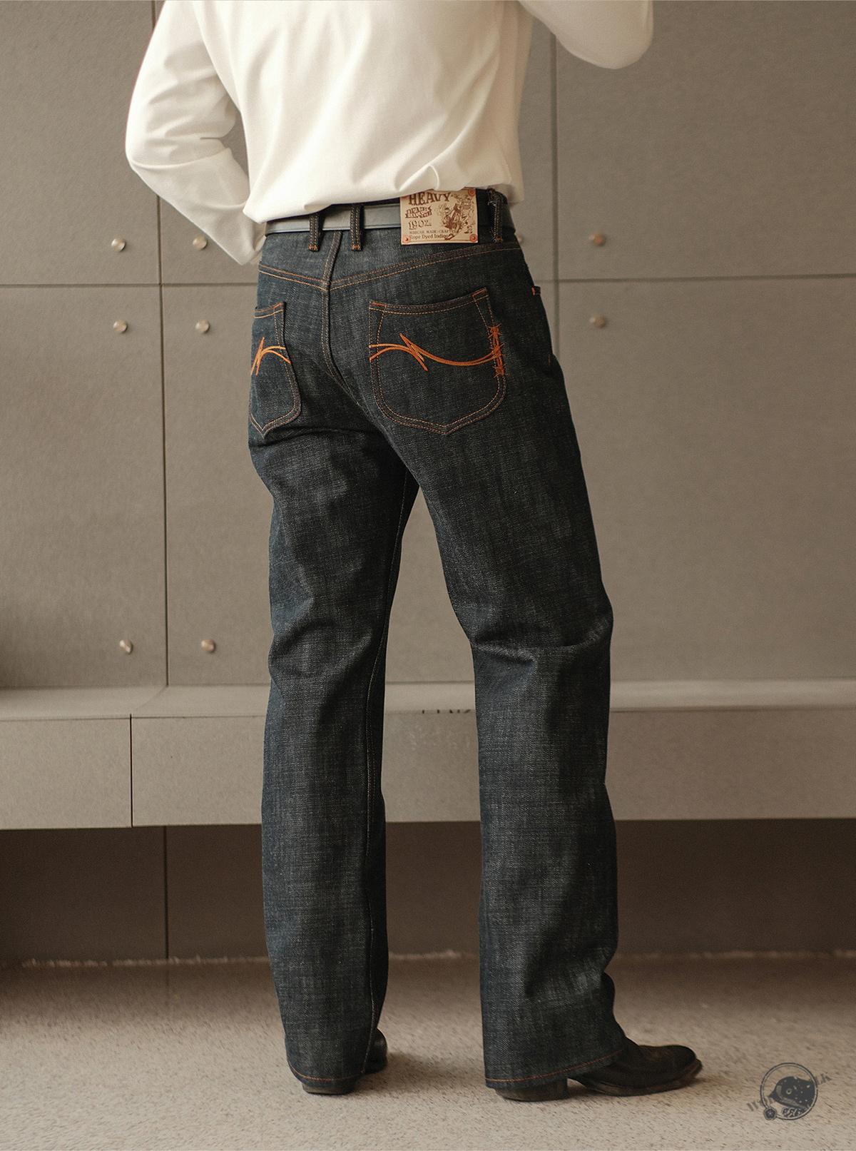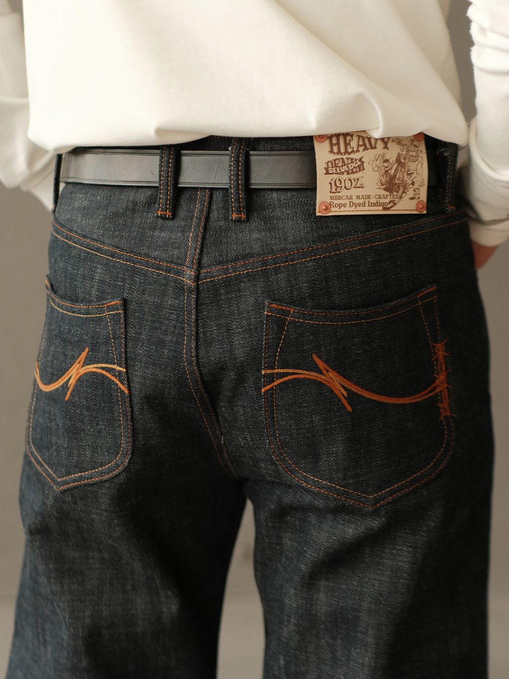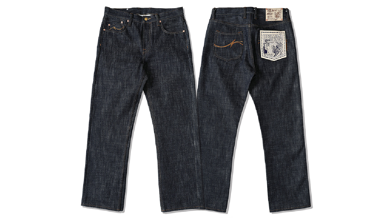 - 19oz 헤비 셀비지 원단 사용, 강한 내구성과 묵직한 질감