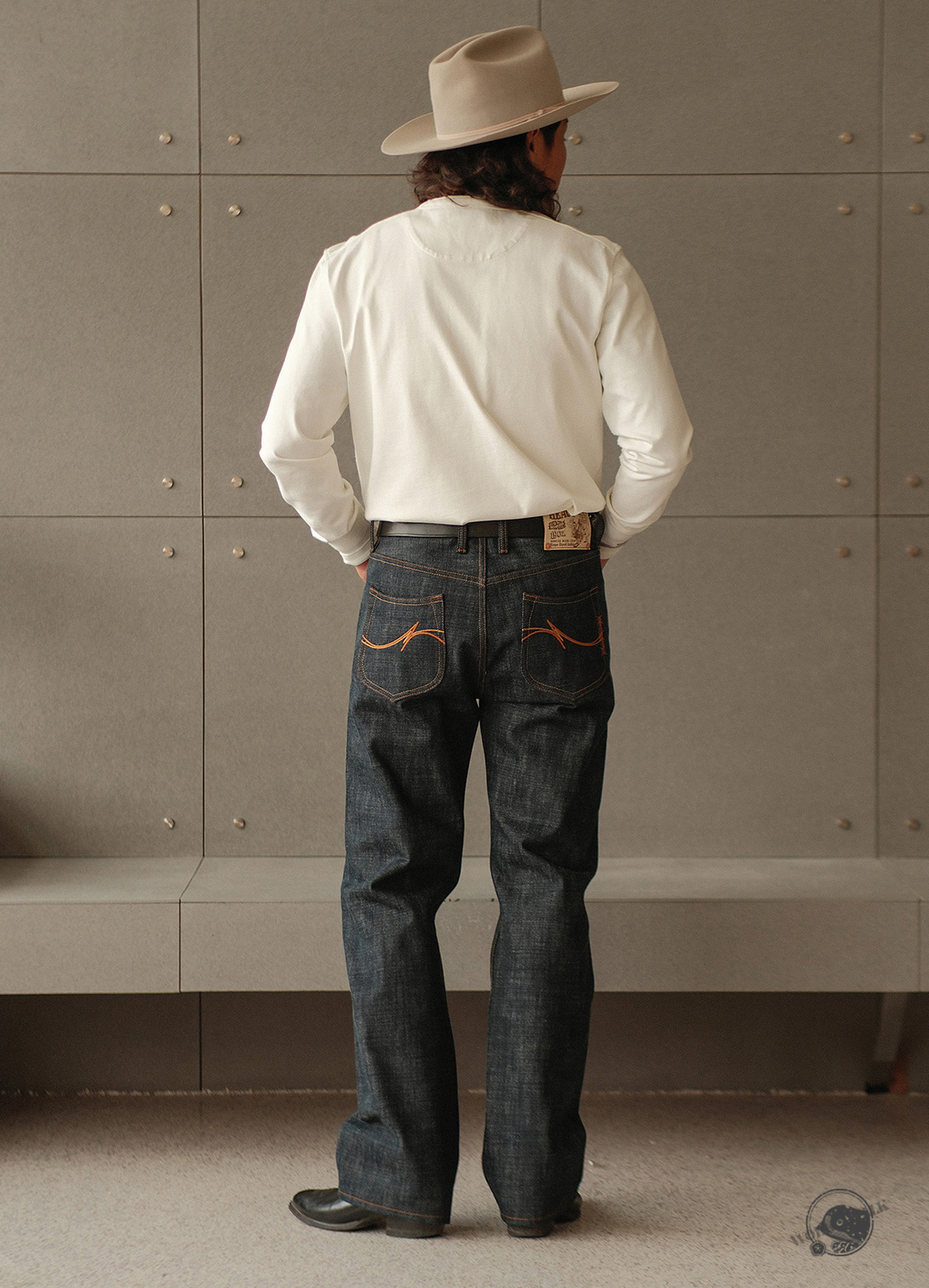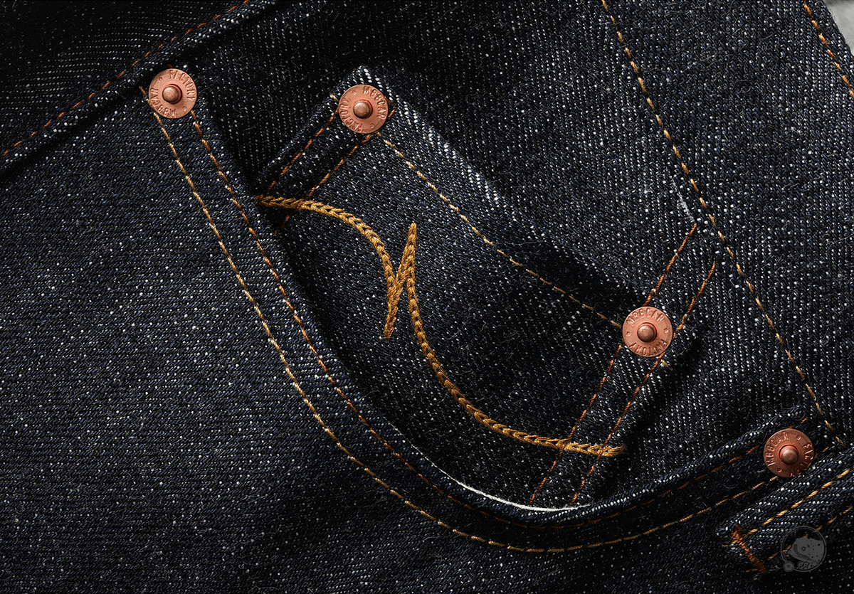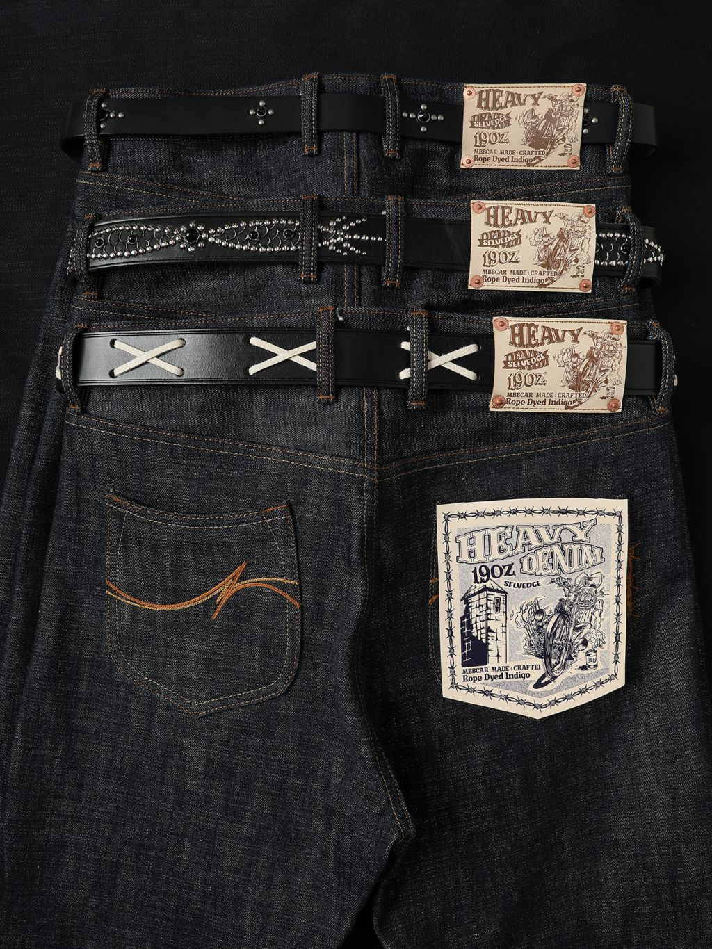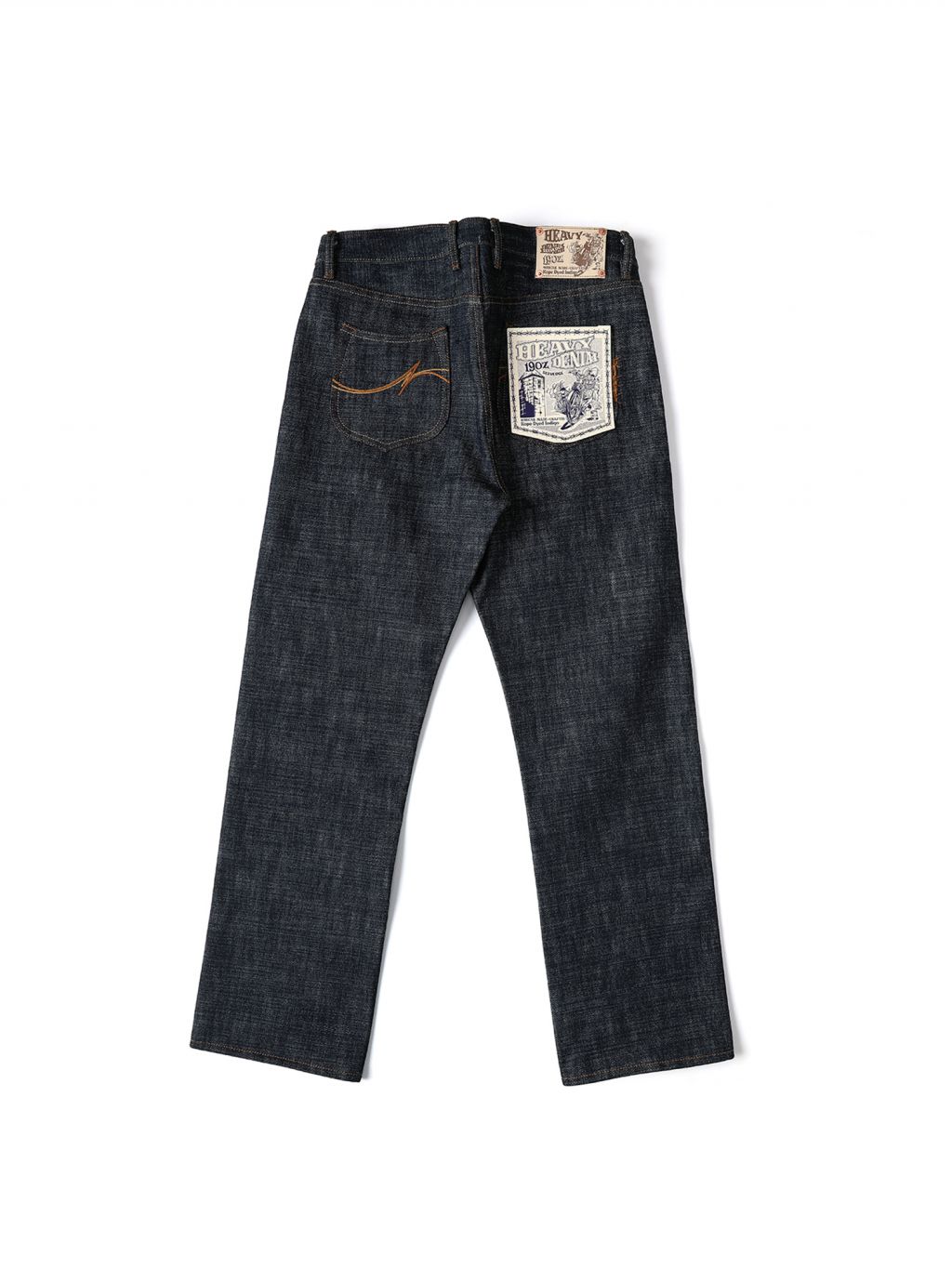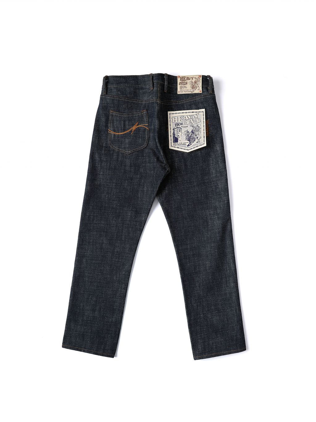 - 19oz 헤비 셀비지 원단 사용, 강한 내구성과 묵직한 질감