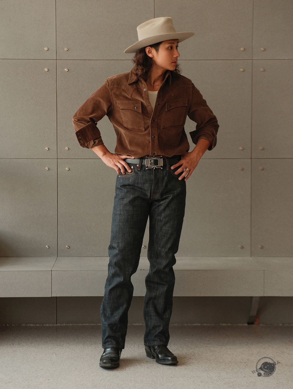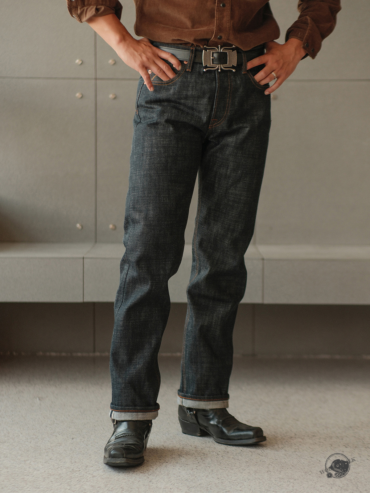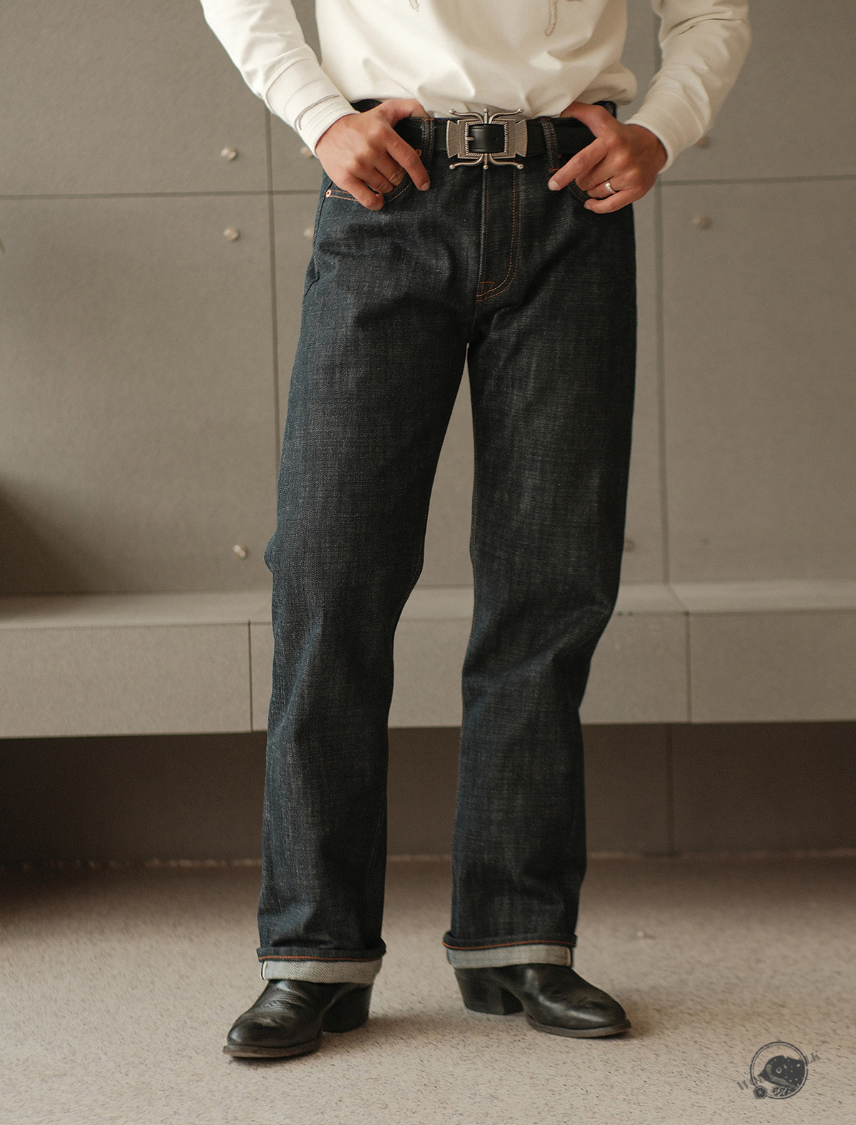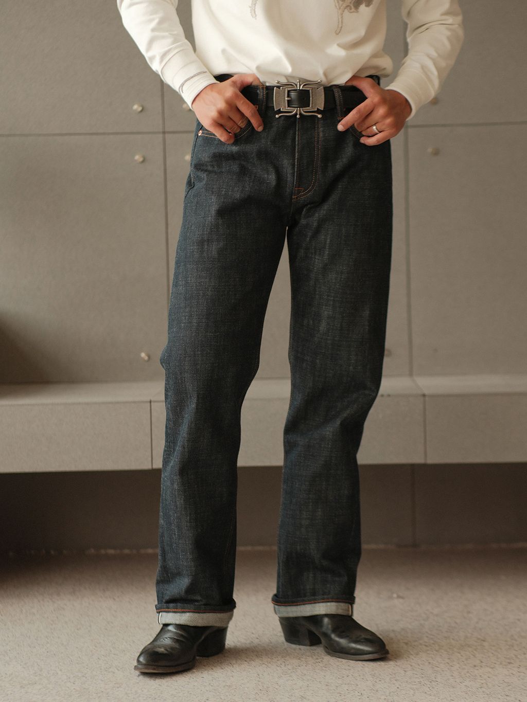 - 19oz 헤비 셀비지 원단 사용, 강한 내구성과 묵직한 질감