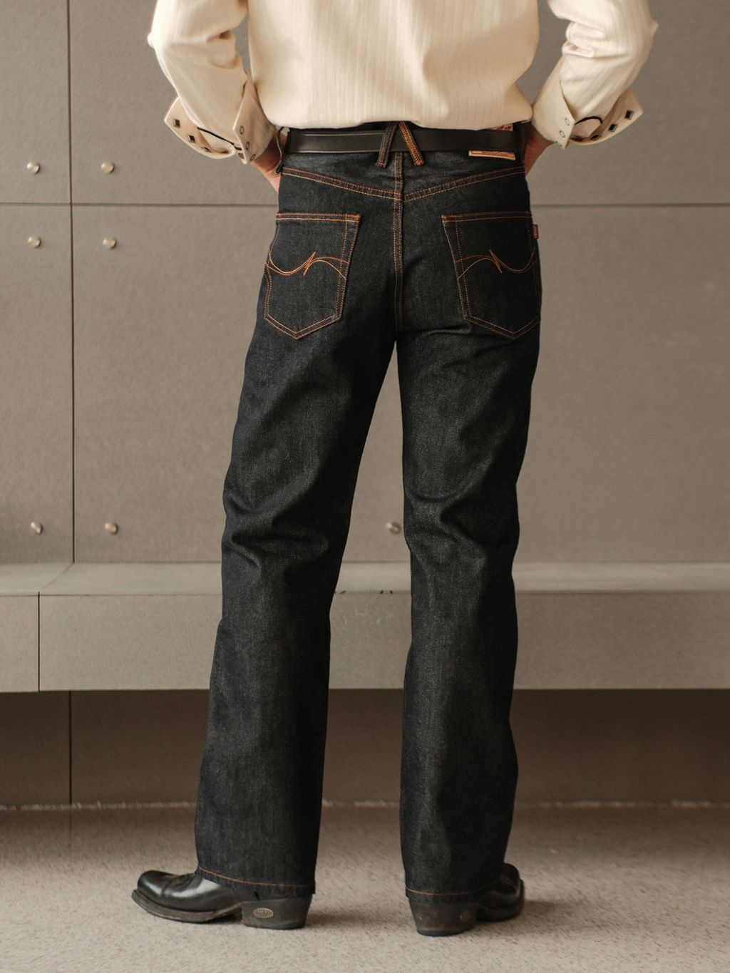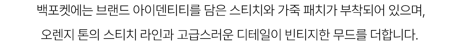 - 오렌지 톤 스티치, 백포켓 시그니처 자수, 헤리티지 가죽 패치 디테일